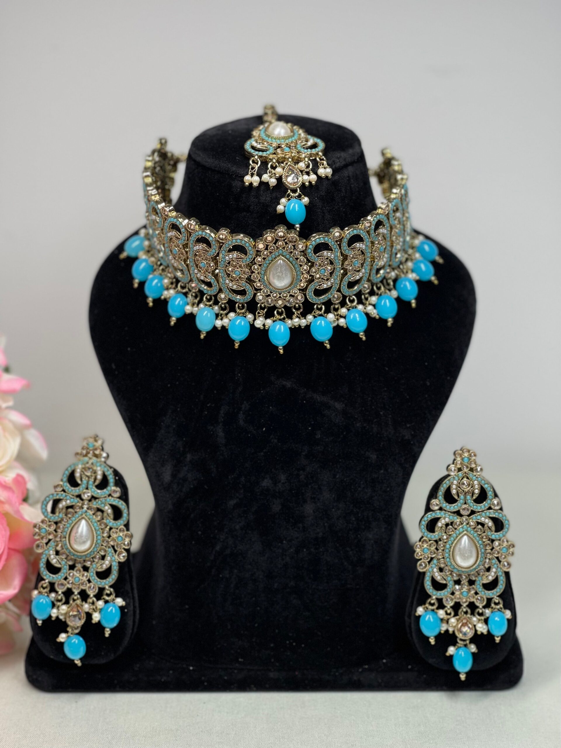Embrace elegance with our Sky Blue Choker Set, crafted to add a refreshing charm to your festive and bridal ensembles. The serene blue tones paired with intricate detailing create a graceful statement. Lightweight and versatile, this set beautifully enhances both traditional and contemporary outfits, making every occasion unforgettable.